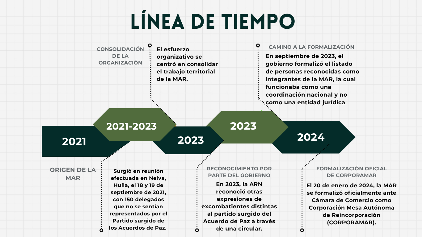 El origen de la MAR aconteció los días 18 y 19 de septiembre de 2021. Ante el abandono de los ex-mandos medios y las bases de las antiguas FARC-EP, en medio de una campaña de estigmatización y persecución, se dieron cita en Neiva los días 18 y 19 de septiembre de 2021 unos 150 delegados, excluidos de la implementación del Acuerdo de Paz y de la Reincorporación, pero comprometidos con lo pactado en el Acuerdo, para hacer un balance del estado de la implementación en todos sus aspectos.
